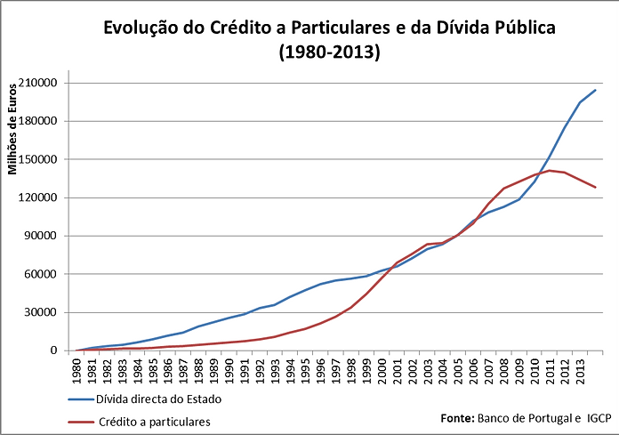 Mas não se pense que este aumento do crédito se sucedeu apenas do lado dos particulares, o Estado português como representante do país seguiu a mesma tendência e fez crescer a sua dívida. No entanto, a tendência crescente do crédito dos particulares tem-se alterado desde 2011, devido às maiores exigências impostas pelas instituições de crédito, como consequência do elevado número de incumprimentos que derivou da facilidade de acesso ao crédito. Já do lado da dívida pública não se verifica um abrandamento do seu crescimento, muito pelo contrário, desde 2010 que o crescimento é bastante mais acentuado que em anos anteriores.